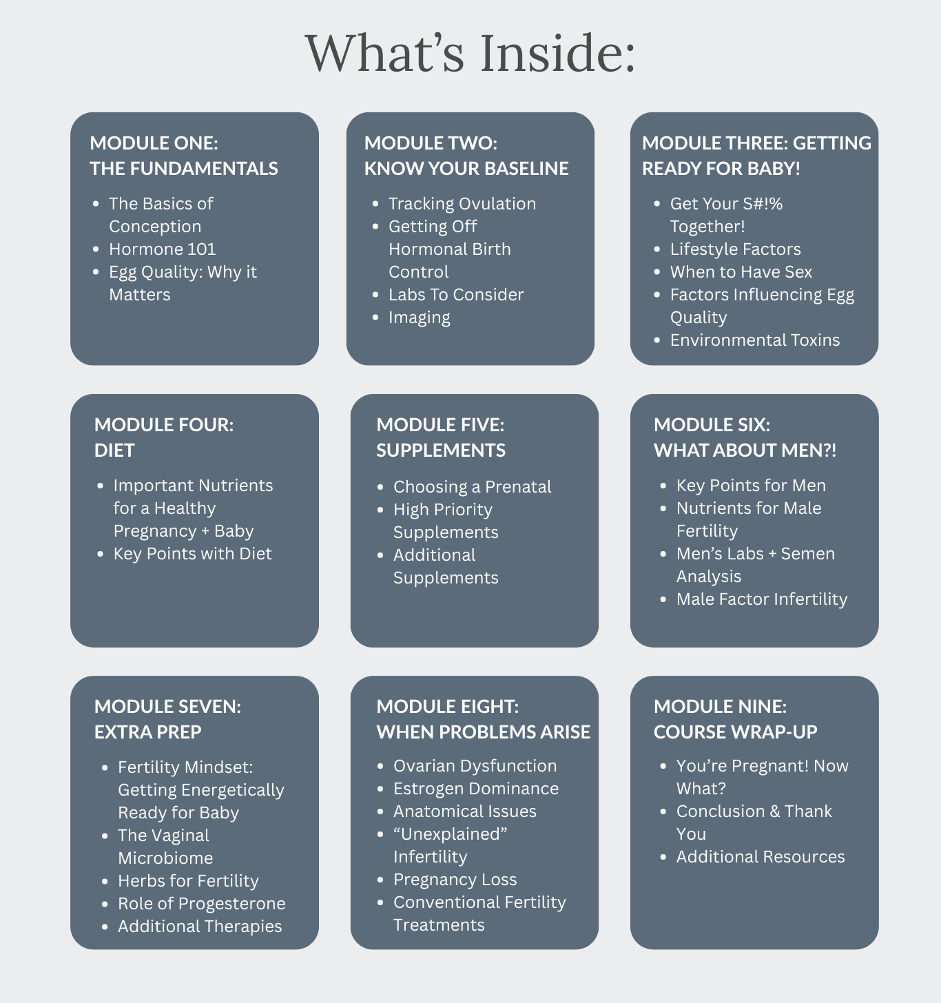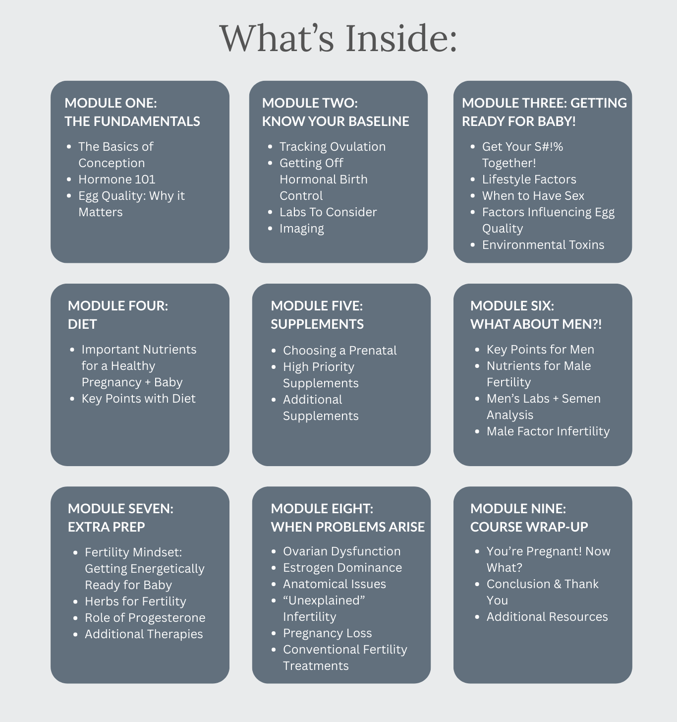 You definitely don't need to take a course to get pregnant–for a lot of people it happens very easily! The goal of this course is to help you get as healthy as possible in preparation for pregnancy to set you and your baby up for success. The course also helps folks with hormonal issues or who have struggled with infertility take charge of their health naturally. For those going through fertility treatments, the info in this course will increase the likelihood of success.
